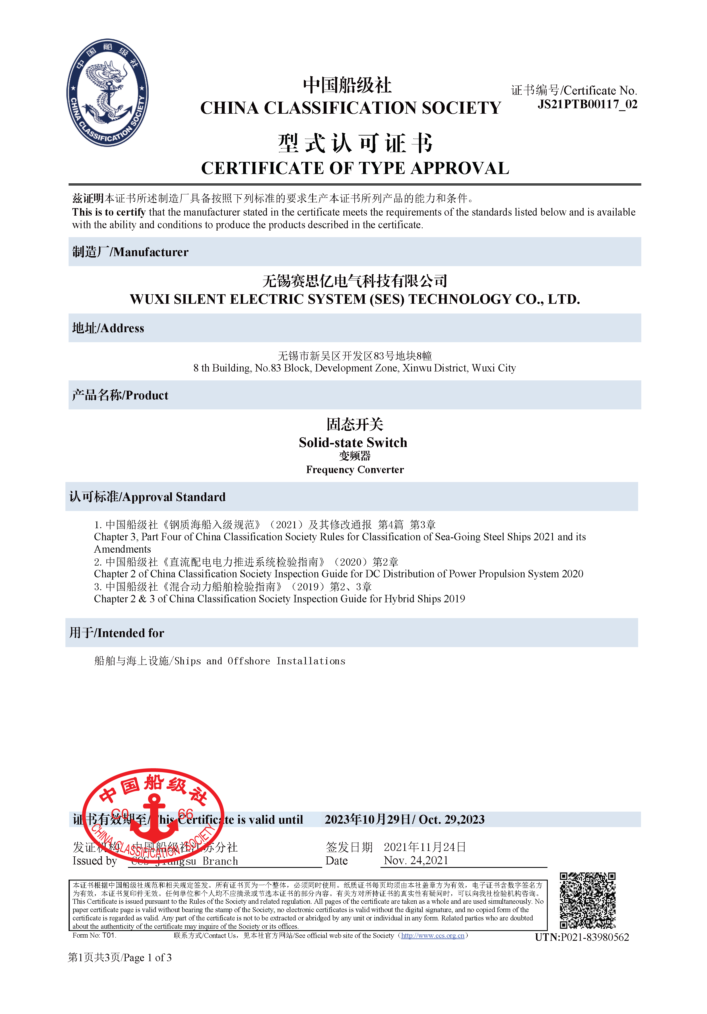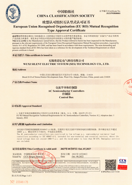 交流半導(dǎo)體控制器歐盟認(rèn)可組織互認(rèn)型式認(rèn)可證書(shū)(CCS)