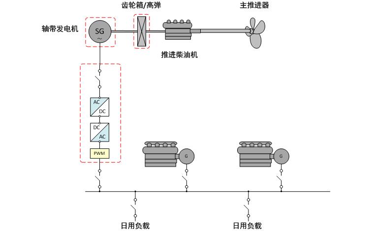 • 軸帶電機和推進主機通過機械方式連接;