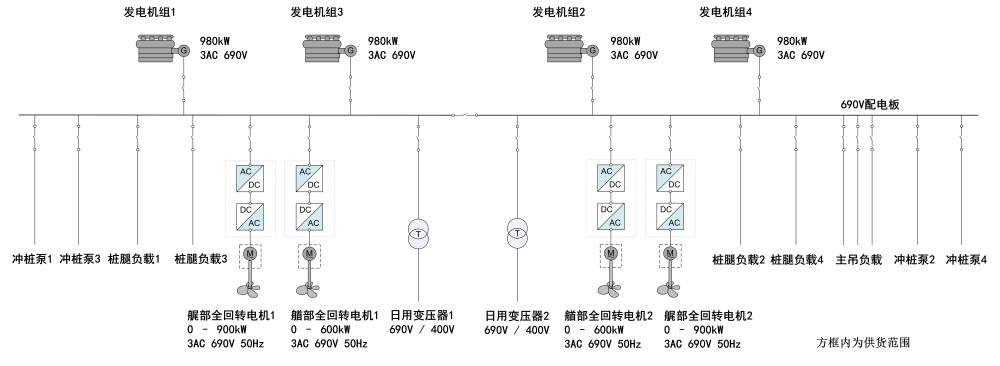 華電穩(wěn)強自升式海上風電作業(yè)平臺電力推進系統(tǒng),賽思億集成范圍包括AFE型推進變頻器、推進電機、推進控制系統(tǒng)及舵槳,相比傳統(tǒng)二極管整流方案(DFE)電氣設備占地面積節(jié)省約15.8m2,節(jié)省重量約12噸,整套系統(tǒng)更加契合風電安裝平臺的要求。