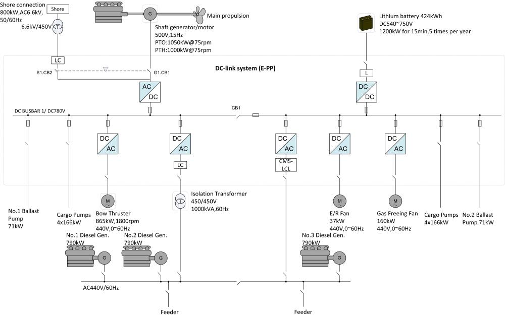 鼎衡15000噸化學(xué)品船,船舶總長147米,型寬22米,入級BV船級社,抱軸電機額定功率為1000kW,同時配置424kWh電池達到削峰填谷的目的,該船舶混合動力系統(tǒng)采用直流組網(wǎng)形式,將主機、發(fā)電機組、電池動力整合并高效分配,為用戶提供高效、綠色、可靠的混合動力。將于2021年年初完成安裝調(diào)試。